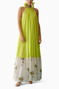 Featuring the Lime Green Halter Maxi Dress by Nikasha. Embrace summery charm with a lime green halter maxi dress featuring a playful banana tree print frill at the bottom, all crafted from 100% cotton. Elevate your style with this breezy and vibrant ensemble.