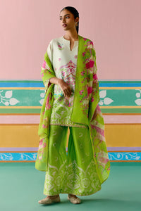 A striking harmony of tradition and elegance, the Lime Green Paisley Kurta Set is crafted in fine Chanderi with hand-embroidered beading on the neckline and lace accents on the sleeves and hem. Paired with flared elasticated pants and a lace-edged organza dupatta, it’s perfect for festive celebrations.