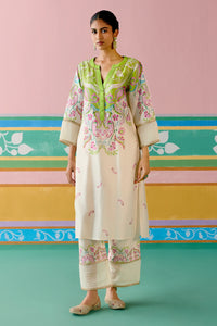 Elegant yet contemporary, the Lime Green Paisley V-neck Kurta Set is crafted in airy Chanderi with delicate organza detailing and lace inserts on the neckline and sleeves. Fine pintucks add texture, while elasticated pants offer comfort and understated glamour.