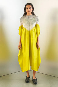 Featuring a free-size silk kaftan with our signature shibori neckline, dyed in vibrant shades of lime and grey for a relaxed yet striking silhouette.