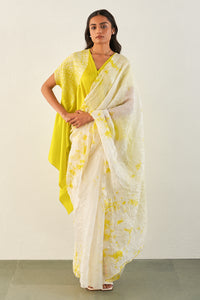 Featuring a crushed shibori saree in silk organza. It comes with an unstitched blouse piece, blending traditional craftsmanship with contemporary elegance for a timeless look.