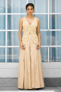 A golden vision in shimmering tissue, this hand-embellished kurta set radiates effortless glamour. With its refined detailing and modern silhouette, it’s perfect for festive occasions that call for understated opulence and timeless style.
