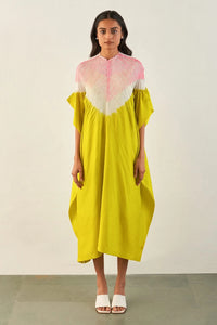 Free-size silk kaftan with our signature shibori neckline, dyed in shades of lime and pink.