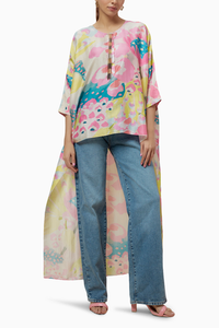 The lime euphoria print silkmul high-low top is a vibrant and stylish addition to any wardrobe. Crafted from luxurious silkmul, this top features the lively Euphoria print in refreshing lime tones, creating a bold and energetic look. The high-low hemline adds a modern touch, providing a flattering, flowing silhouette that moves gracefully.