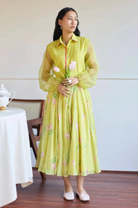 Unveiling the handwoven Chanderi relaxed-fit shirt, graced with a delicate pink border and ethereal organza silk sleeves, blending timeless elegance with modern grace. Paired with the handwoven Chanderi tulip skirt, bathed in radiant lime and adorned with charming tulip blooms, this ensemble captures the beauty of nature and craftsmanship. Soft gathers and effortless movement create a symphony of color, texture, and delight.