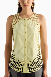 Featuring the Lime Sunray Shirt by MellowDrama's Utopia Collection. Crafted from 100% cotton, this sleeveless shirt features a front opening with buttons and a handmade sunray weave panel at the front. It offers a regular fit, combining casual comfort with distinctive style.