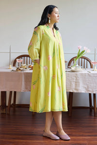 Presenting the handwoven chanderi relaxed-fit dress, Adorned with tulip prints, graceful and bright, A front gather at the neck, soft and poised, A delicate detail that catches the light. Each bloom dances with timeless grace, While the fabric flows with gentle ease, A dress that speaks of beauty and bloom, A perfect harmony, calm and free.