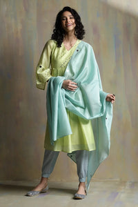Featuring a Chanderi kurta with mirror-embellished bell sleeves and intricate mirror work on the yoke. This kurta set is paired with a Chanderi dupatta, adorned with mirrors on the border, and cotton joggers embellished with mirrors, blending traditional charm with modern style.