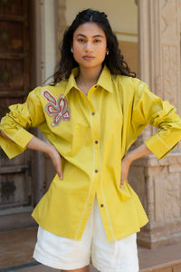 Featuring Lime Yellow Sulfer Shirt from URAIB's collection Summer Lovin'. The product is made from 100% cotton poplin highlighing hand embroidered beaded dramatic flower on the shirt.