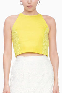 Featuring a chic crop top with a round halter neckline and delicate Schiffli inserts on each side. Crafted in an embroidered slim fit and finished with a concealed side zipper, it offers a sleek, feminine silhouette with effortless charm.