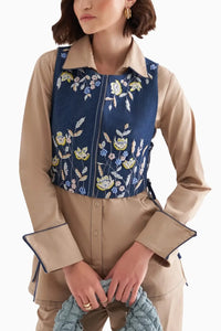 This denim embroidered Lindy jacket features a trendy half-jacket design with stylish tie knots and contrast stitch line detailing. A perfect blend of casual and chic, it adds a unique touch to any outfit.