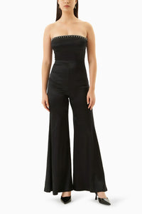 The Lio jumpsuit features a bandeau neckline with extraordinary rhinestone detailing. It is full length and has a slightly wide leg. It's a fitted jumpsuit made from a stretch viscose, allowing the best fit and comfort when worn.