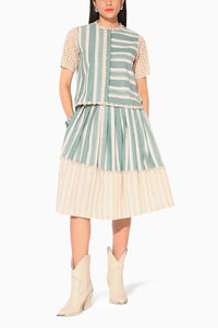 The Liora Skirt Set features a relaxed stripe-play design with a pleated textile-mix skirt, complemented by subtle detailing. This effortless ensemble blends texture and pattern for a chic, modern look.