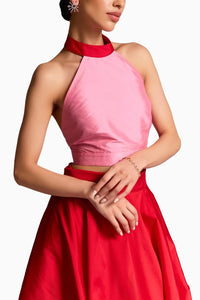 This sleeveless halter Liora top features a soft pink silk finish with a high neckline, offering a sleek, contemporary look. Ideal for pairing with high-waisted skirts or trousers, it combines elegance with modern minimalism, The open-back design with a secure tie detail adds a bold, graceful touch, enhancing its chic appeal.