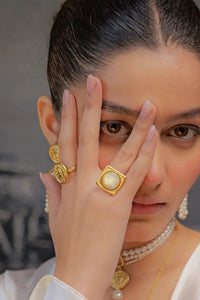 Simple, sleek and polished - this minimalist ring boasts of an interesting play of shapes. A 22kt gold plated base in square shape is juxtaposed with a circular shaped flat pearl. Perfect balance of bold and refined, this sleek ring is celebration of geometry and presents it in a minimalist way. A great way to add a touch of luxury and modernity to any outfit. The ring is extremely wearable and versatile, making it a great travel accessory. Complete the look with the matching stud earrings or brooch from the collection.
