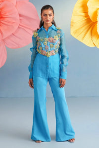 Sweet yet statement-making in Candy Blue, the Lola Candy Co-ord Set is a charming 3-piece ensemble with a shirt, inner, and tailored pants. Crafted from pure silk organza and imported crepe, it’s adorned with vibrant multicolour 3D floral work that adds a playful, whimsical edge. This set beautifully captures the romance of the English era and Parisian elegance — perfect for evening wear and formal occasions.