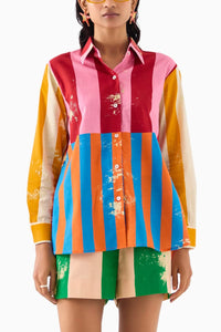 The Long Beach Shirt and Shorts Co-ord crafted from our 100% cotton fabrication, trans-seasonal, is a statement piece. The shirt, made in our Multi color stripes print, is part of a 2 piece set. The shirt has a relaxed fit and has full sleeves. Featuring a summery look, it has gathers on the back. Paired with Long Beach shorts with a front zipper, it looks chic. Wear it with heels for an elegant look.ÂÂ