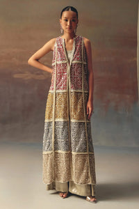 Featuring a long, multicolor sleeveless overlay, this piece offers a comfortable fit with a vibrant touch, perfect for layering over festive or casual ensembles.