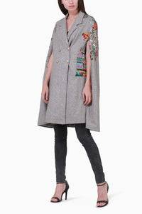 Featuring a Long Tweed Cape with Moscow-inspired quirky embroidery, this statement piece blends classic sophistication with playful, artistic flair. The rich tweed fabric offers warmth and style, while the unique embroidery, inspired by the vibrant culture and intricate designs of Moscow, adds an unexpected twist. The bold, detailed stitching along the cape creates a striking contrast against the textured fabric, making it a standout piece for both casual and formal occasions.