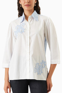 White shirt featuring cutwork flowers in a striped pattern. Made from cotton with blue applique work on white fabric, designed in a straight fit with detailed cutwork applique.