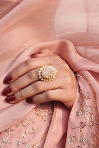 The Essence- Reflecting the meticulous detailing of Mughal miniature artworks, this ring features an 8-carat dusty pink center stone with a vine of Kundan work.