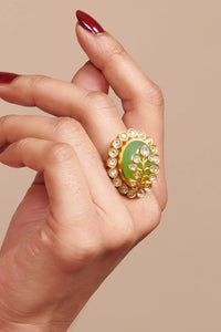 The Essence-Reflecting the meticulous detailing of Mughal miniature artworks, this ring features an 8-carat pale green center stone with a vine of Kundan around it.