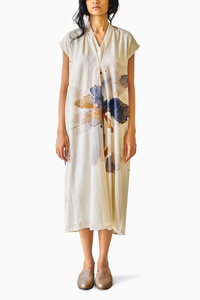 This breezy off-white kaftan dress, crafted from soft and breathable cotton fabric, exudes timeless charm with its elegant statement print. Designed for comfort and style, it includes practical side seam pockets, making it a versatile and chic addition to your wardrobe.