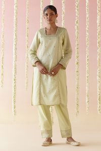 Fabric- Kurta: Crushed Tissue, Pant: Chanderi Color- Lotus Green Components- 2 Product Code- SVENEROGMKS17