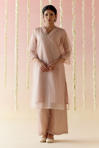 This refined Kurta, crafted from sheer fabric for a delicate appearance, features intricate dori French knot embroidery on the neckline. It comes with a striped tissue slip and pairs beautifully with striped tissue flared pants. The ensemble offers a stylish and sophisticated look, perfect for any elegant occasion.