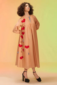 Featuring Love Bug Peach Dress by Chilosophy's Queendom Collection, this lively dress features a 3D heart patch, exaggerated flare from gathered yoke, and a denim pocket with an embroidered quote: "you call it madness, I call it love." Contrast neckline and hem facing add extra flair.
