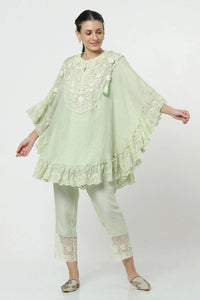 Featuring the Love Lace Croissant Co-ord Set in 100% linen, this relaxed-fit ensemble includes a flowing circular top with a round neck, delicate lace neckline, and romantic English floral embroidery, finished with a charming lace hem for an elegant, timeless look.