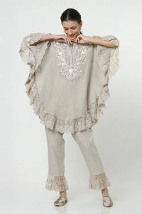 Featuring the Love Lace Croissant Natural Co-ord Set in 100% linen, this relaxed-fit ensemble showcases a flowing circular top with a round neck, adorned with a delicate lace neckline, English floral embroidery, and a romantic lace hem for timeless elegance.