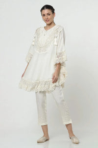 Featuring the Love Lace Croissant Off-White Co-ord Set in 100% linen, this relaxed-fit ensemble includes a flowing circular top with a round neck, delicate lace neckline, English floral embroidery, and a romantic lace hem, perfect for timeless and elegant style.