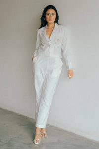The Margao Cropped Set is a stylish 2-piece ensemble featuring a cropped full-sleeve shirt with a hand-embroidered pocket, adding a unique and artistic touch. Paired with narrow pants, the set offers a sleek, flattering fit, while the elasticated waistband at the back ensures comfort and flexibility. Functional pockets complete the look, offering both style and practicality. Perfect for a chic, modern wardrobe, this set blends elegance with comfort effortlessly.