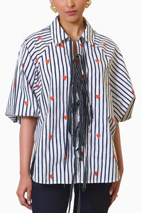 Add a touch of romance to your wardrobe with this stylish Chic Striped Heart Blouse. Featuring a classic black-and-white vertical stripe pattern adorned with adorable red heart prints, this blouse blends elegance with playfulness. The collared neckline and statement lace-up front add a unique charm, while the billowy sleeves with elastic cuffs offer a relaxed yet fashionable fit. Perfect for casual outings, date nights, or office wear with a fun twist, this top pairs effortlessly with jeans, skirts, or tailored pants for a versatile look