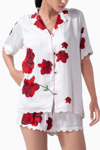 The Lovers & Roses Scalloped PJ Shorts Set is crafted for playful comfort, featuring a scalloped-collar printed shirt and matching printed shorts with a sweet scalloped hem. Made from soft modal, this printed pajama Set offers a stylish yet comfortable option for lounging or sleeping. Whether you’re relaxing at home or drifting off to sleep, this shorts Set combines chic design and all-night comfort, making it an ideal addition to your sleepwear and nightwear collection.
