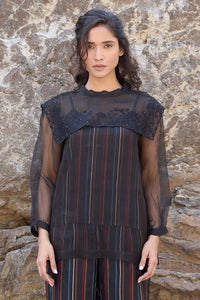 The Luc Black Top is a delicate sheer piece featuring exquisite hand embroidery on the neck flap, adding a refined touch of detail. Paired with a complementary camisole for comfort and coverage, this top effortlessly blends elegance and subtle allure for a sophisticated look.