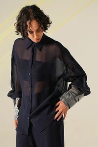 Featuring an oversized shirt in sheer navy blue viscose organza, this piece is designed with a drop shoulder silhouette, full-length sleeves, and defined cuffs. Transparent PVC line work embroidery accents the cuffs and extends partially along the sleeves. Finished with a classic collar and front button-down closure for a refined, modern look.
