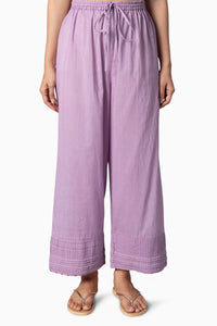 Luci Pajama in a soft lavender shade is adored with a playful and vibrant printed red polka dot facing, featuring a textured bottom with vertical and horizontal pleats.