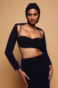 Featuring the Lumen Bustier, a sculpted black piece adorned with delicate all-over hand-embroidered electric blue loop work. It has thin adjustable straps and a structured fit, designed to pair perfectly with matching sleeves and skirt.