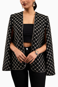 A luxurious black cape jacket adorned with hand-embellished crystal lattice beadwork. Its clean open-front silhouette and tailored finish create instant glamour, making it the perfect statement piece for festive events, weddings, or sophisticated high-fashion evenings.