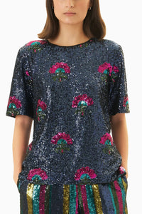 The Luna top is cra fted on a ba se of na vy blue meta llic sequins with a pla y of a flora l motifs. The top is a pla y of shine a nd spa rkle -elega nt a nd festive! Styled a s a loose stra ight top with short sleeves - you could pa ir it with your fa vourite da rk jea ns or combine it with our Luna pa nts to da zzle a nd da nce the night a wa y !