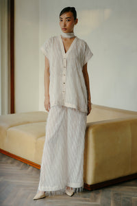 Featuring the Luna Fringed Co-ord Set by Trisara's Fuss Over Me Collection. Crafted from fringed georgette fabric in cream, this straight-fit set features a chic fringe detail and short sleeves, offering a playful yet sophisticated look.