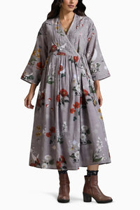 A double layered dress with soft quilting on the yoke made in an Angrakhi style. It highlights our signature hand painted botanicals digitally placed all over. The dress features a drop shoulder and stitch line details. It has an attached lining.
