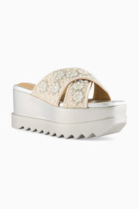 A Whisper of Moonlight. Soft as a midsummer breeze, luminous as the first silver stars—Luna carries the poetry of a moonlit night. Delicate pearls bloom across silken folds, tracing whispers of stardust with every step. Light glimmers, dreams wander, and the world slows to admire.A dance of elegance and enchantment, Luna is not just a sandal—it’s a feeling.The artisans of Anaar take 20 hours to carefully construct this pair.
