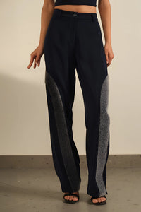 The Lunar Arc Trousers feature a relaxed straight-leg silhouette with signature hand loop embroidery in transparent PVC cords along the side panels. They have a high-waist fit with front button and zip fastening for a polished finish.