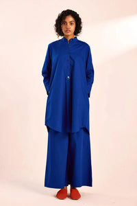 An electric blue Poplin set featuring a tunic with a regular collar, buttoned front, and side seam pockets—paired with matching trousers for a bold, modern look.