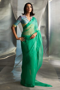 This green saree, adorned with intricate embroidery on the pleats, exudes the regal essence of traditional Indian attire. Crafted from exquisite green fabric, it enhances elegance and charm. Paired with a blouse in three vibrant colors, each featuring detailed embroidery, this ensemble offers a personal and unique touch. It's a timeless choice for those looking to make a statement, embodying the dignified grace of a queen.