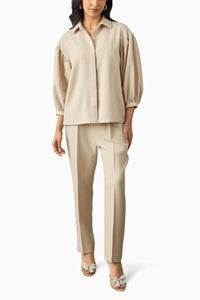 levate your wardrobe with the Luxe Glow Minimalist Co-ord Set, a refined yet effortlessly stylish ensemble designed for modern sophistication. Crafted in a soft beige hue with subtle shimmering accents, this two-piece set exudes understated elegance. The relaxed-fit top features a concealed button-down front, voluminous gathered sleeves, and a classic collar for a polished look. Paired with a sleek, tailored skirt, this set offers both comfort and chic appeal. Perfect for formal occasions, evening gatherings, or an elevated everyday lookâ€â€style it with statement accessories and heels for a timeless, graceful outfit.