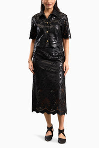 A striking laser-cut ensemble featuring a short-sleeve button-down shirt with decorative buttons and a matching midi pencil skirt. The intricate cutwork and scalloped edges create subtle sheerness, offering an edgy, sophisticated, high-fashion look perfect for chic daytime wear or evening statements.